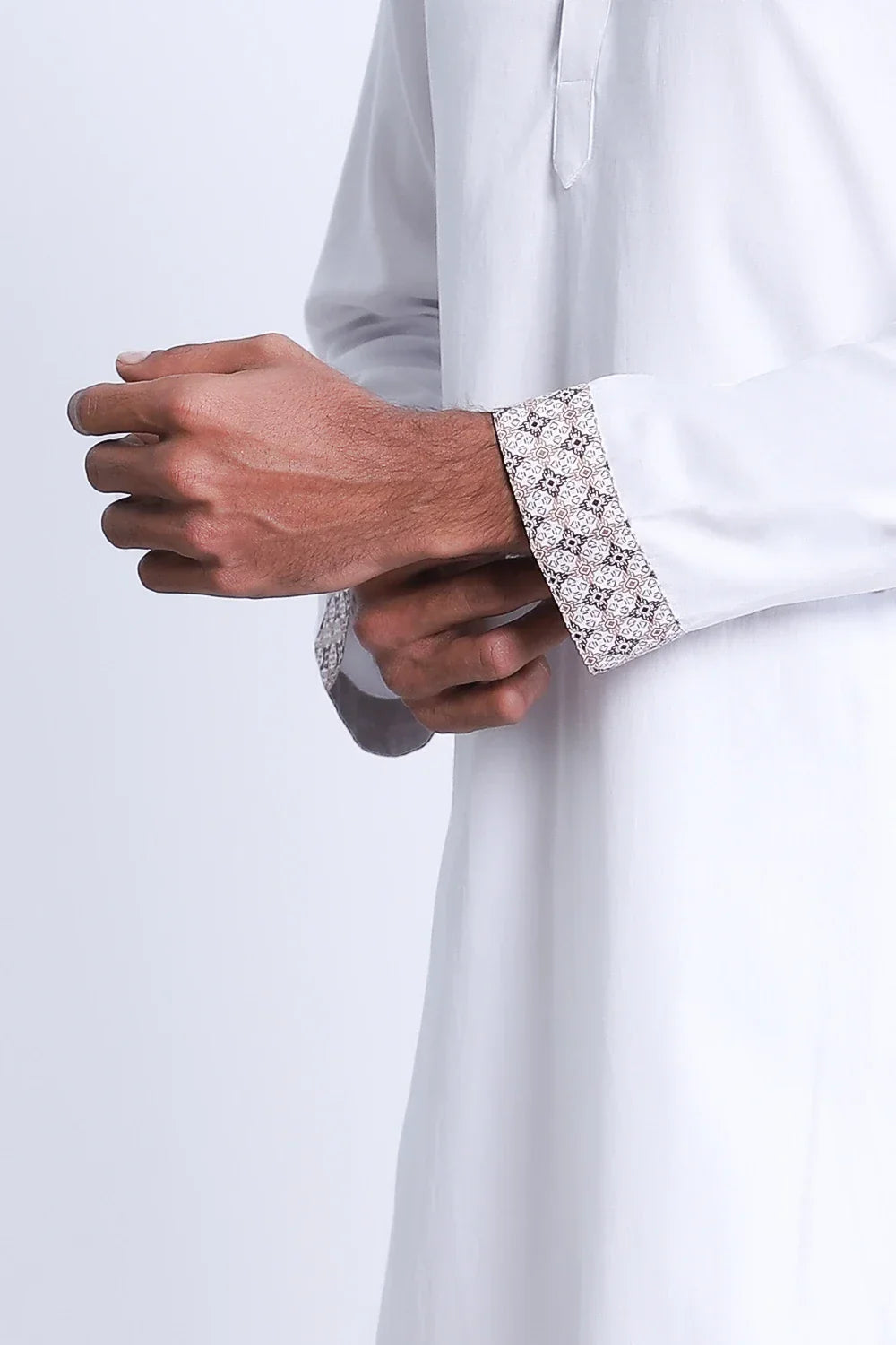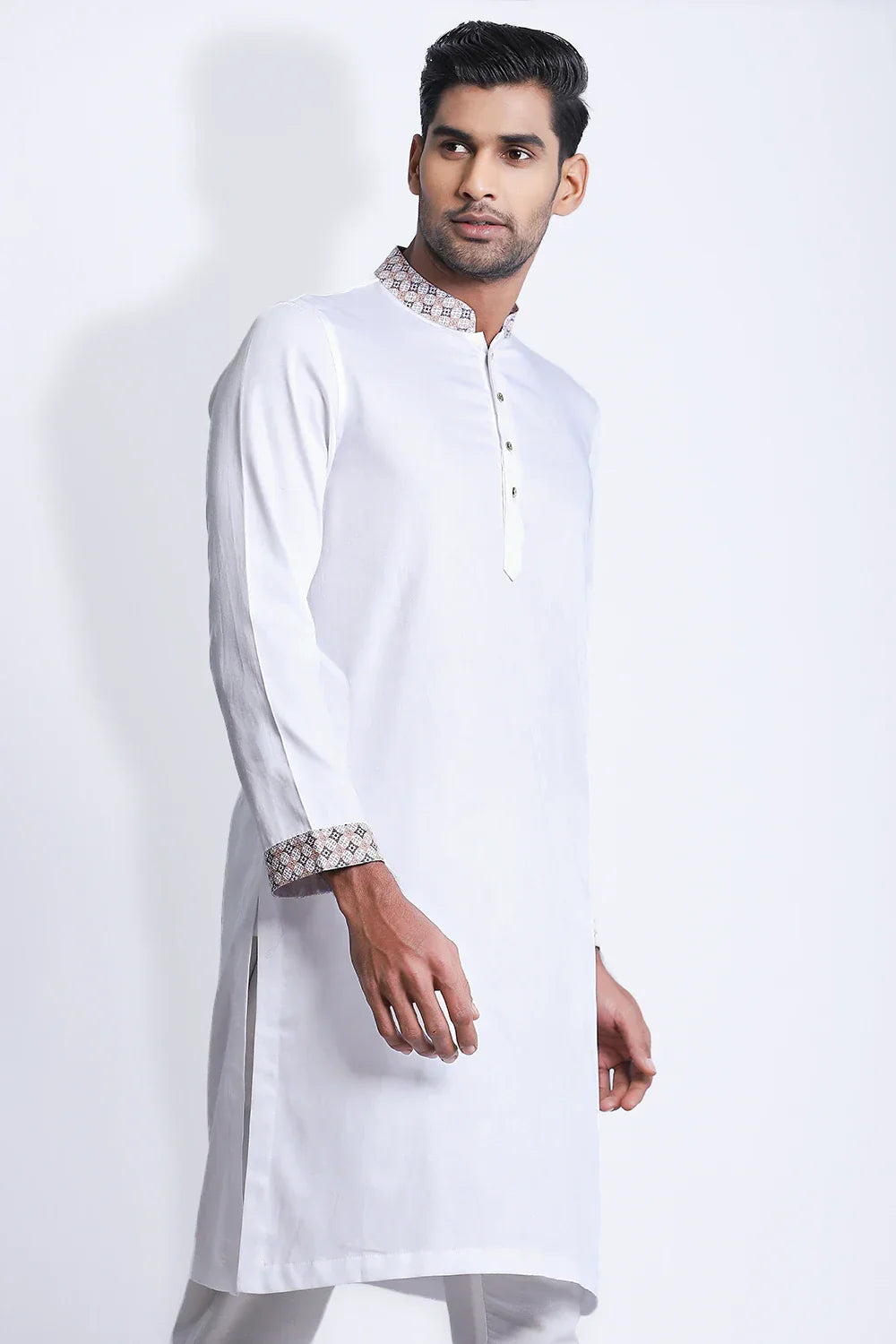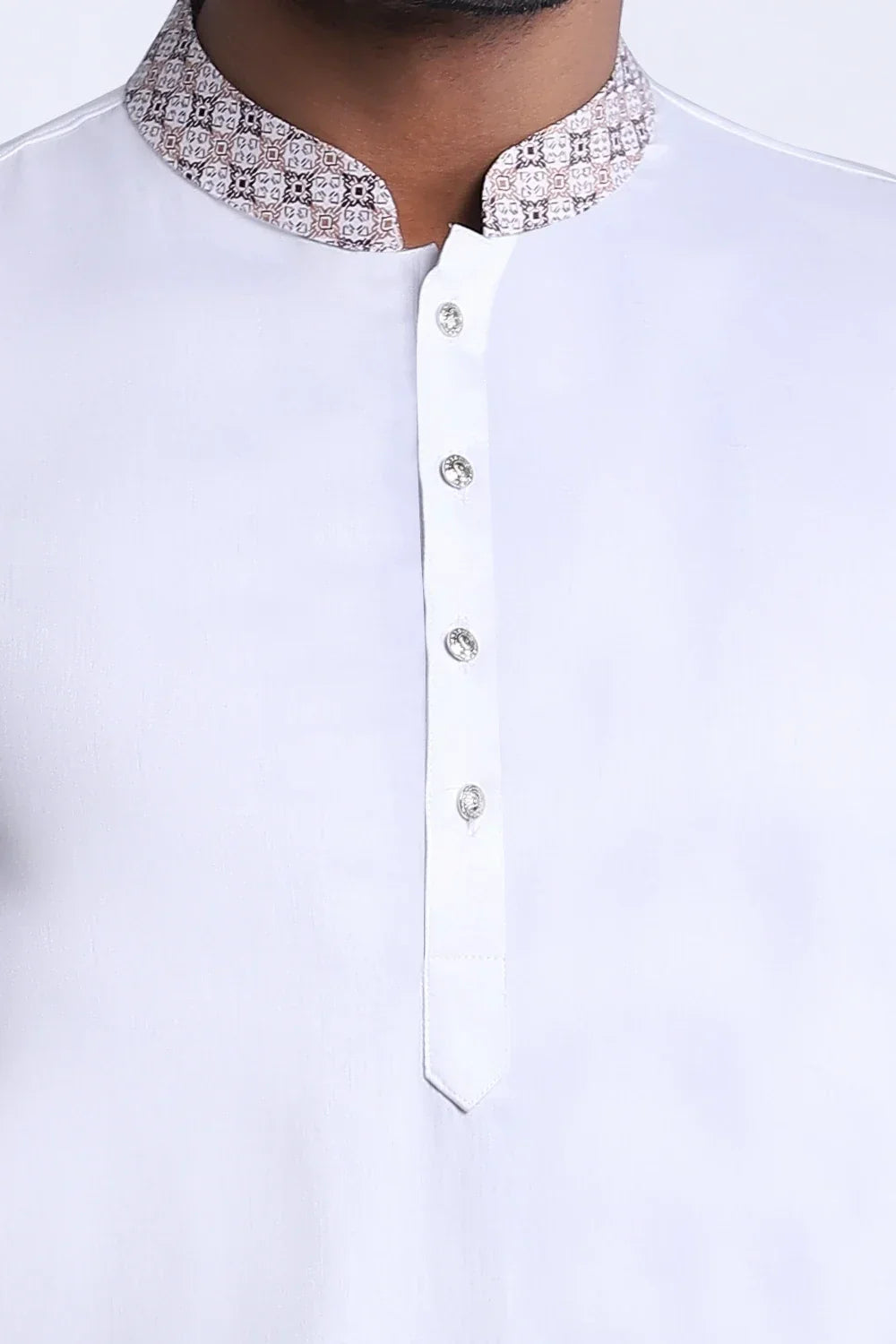 Discover the perfect blend of comfort and style with our Cut and Sew Regular Fit Panjabi, meticulously crafted from 100% Cotton. It features printed contrast fabric on the collar and sleeve hem for added flair, complemented by classic metal buttons on the placket. Redefine your wardrobe staples with this timeless piece that seamlessly combines comfort, sophistication, and modernity.
