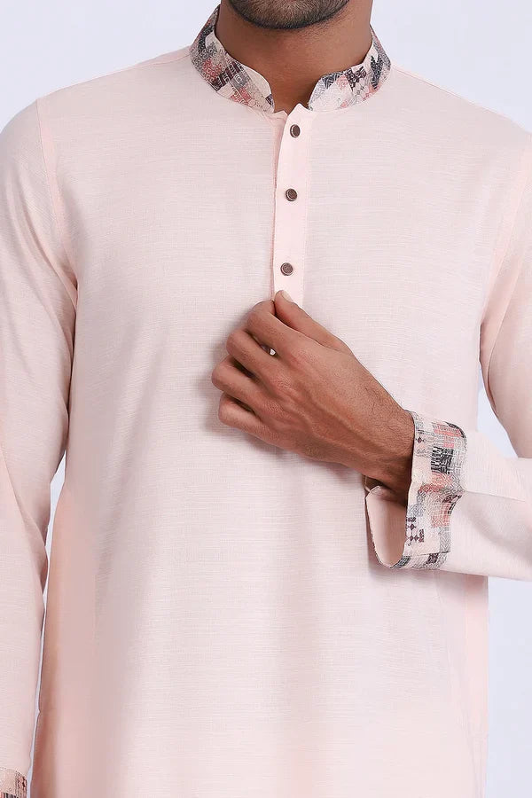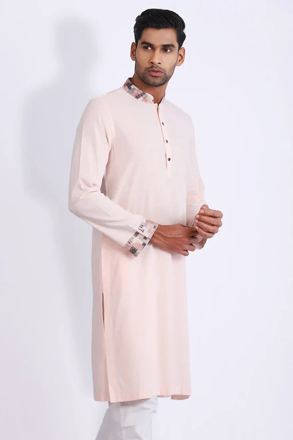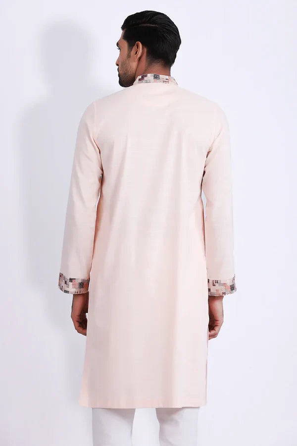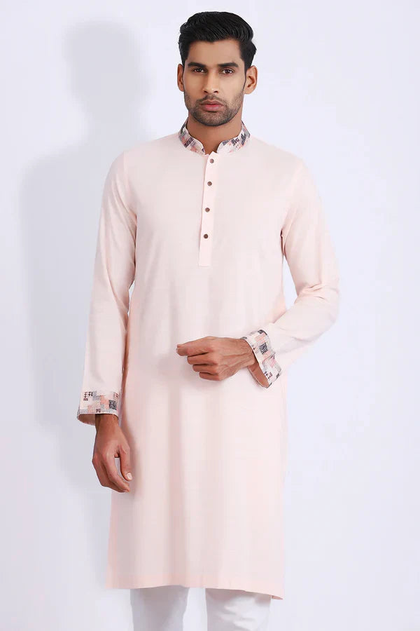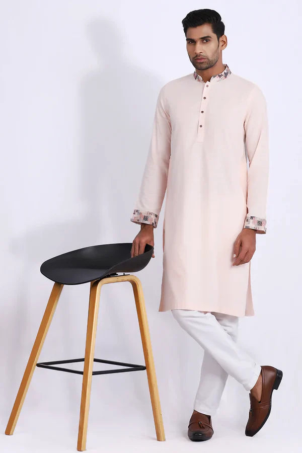 Introducing our Cut and Sew Slim Fit Panjabi, crafted from 100% cotton for ultimate comfort. This stylish piece boasts a sleek mandarin collar, enhanced with eye-catching contrast details on the collar, placket, and sleeve hem. The addition of decorative sequence jacquard fabric adds a touch of sophistication and finished with elegant metal show buttons on the placket for a polished look. Perfect for weddings, festivals, or any special occasion, this panjabi merges style and tradition seemlessly.