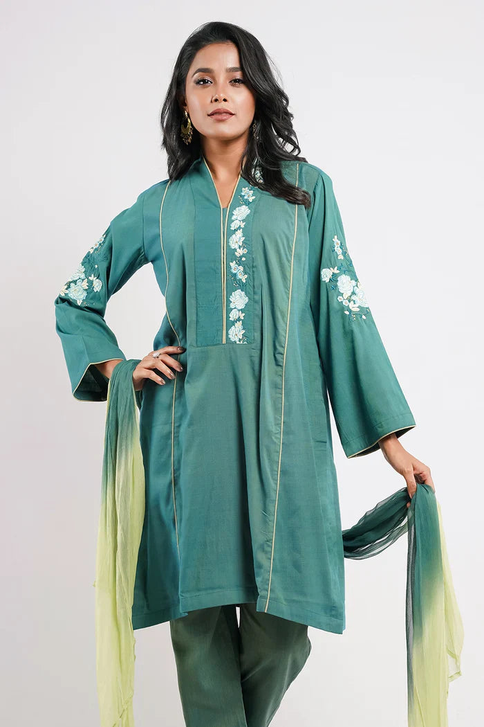 Crafted from soft cotton, our Embroidered 3 Piece Set offers a perfect blend of comfort and elegance. This set includes stylish pants and a shaded dupatta, with intricate embroidery on the kaftan neck and sleeves adding a touch of sophistication. Contrast color piping highlights the bell sleeve hem, kaftan neck, and kameez front, creating a refined and coordinated look. Ideal for both casual and festive occasions, this set beautifully combines traditional charm with modern flair.