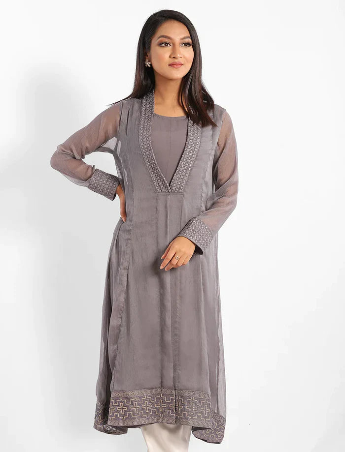 Want to set yourself apart from the rest? Then look no further. This is a chiffon long flare shrug in princess cut adorned with intricate embroidery work on the kaftan neckline, sleeve opening, and bottom hemline. It comes with an inner made of viscose fabric. Wear it to every occasion, and you'll look stunning every time.