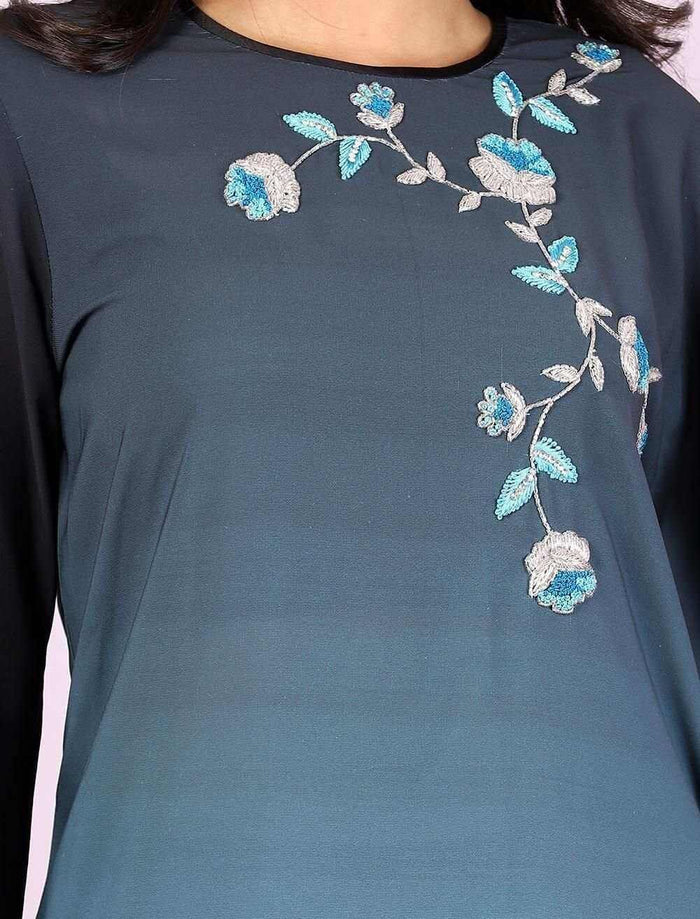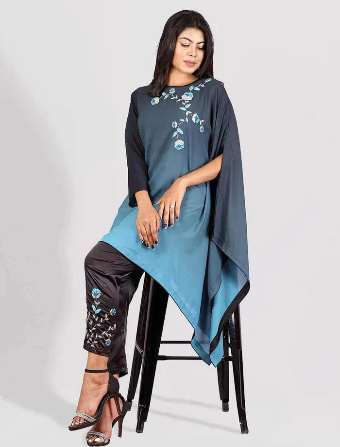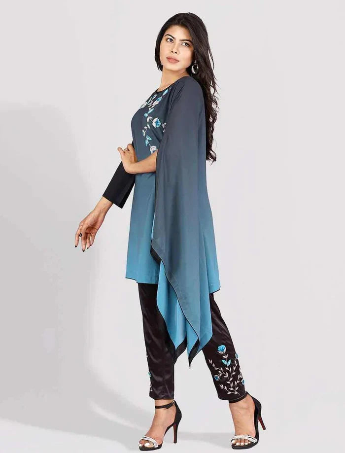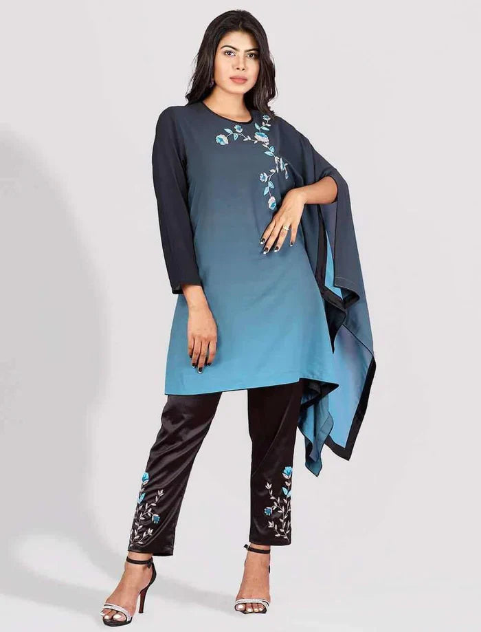 This elegant Kurti should be your attire of choice if you want to establish your presence. It is an asymmetric design with an Ombre double georgette. It has a left-side kaftan with a slit and Zardozi work done on the chest, right sleeve, and bottom hem. This Kurti is made up of 100% polyester.