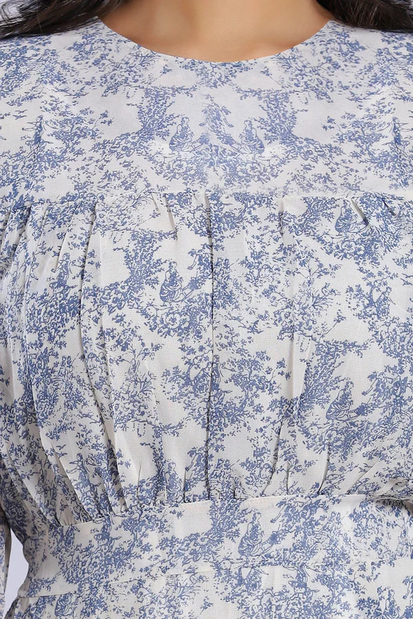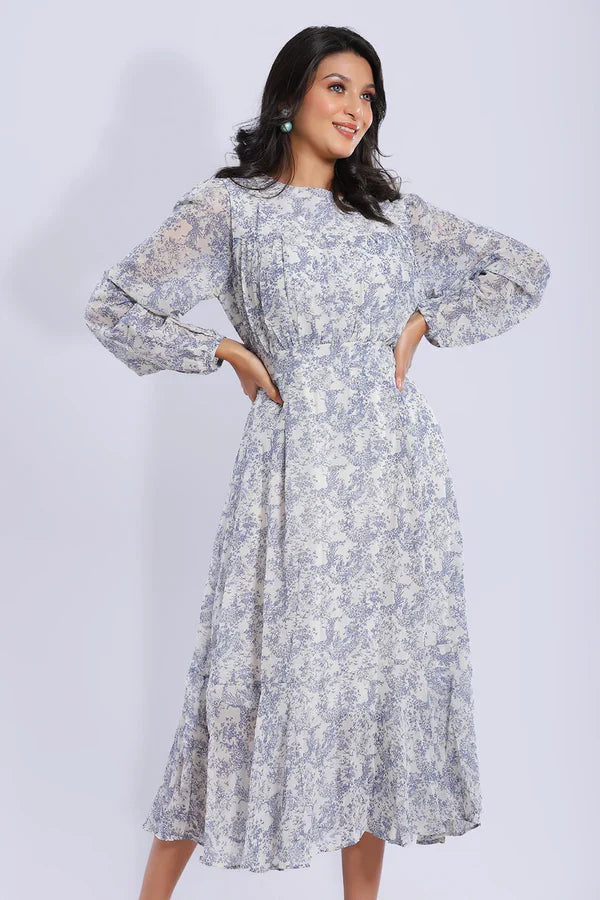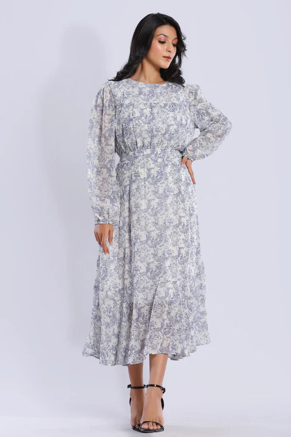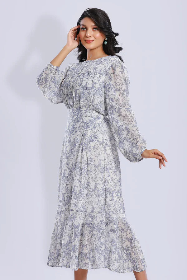 Introducing the Printed Long Dress, a beautiful blend of style and sophistication. This floral-printed dress features subtle pleats at the chest for an elegant touch, with full-length sleeves that add a refined look. Designed with a back zipper for easy wear and a matching shell fabric belt to accentuate the waist, the dress offers a flattering fit. Falling just above the ankle, this versatile piece is perfect for any occasion, combining comfort with timeless charm.