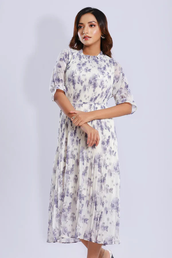 This pleated long dress features elegant puff sleeves and a flattering ankle-length design. It showcases delicate ruffles along the neckline with a subtle keyhole detail, adding a touch of sophisti...