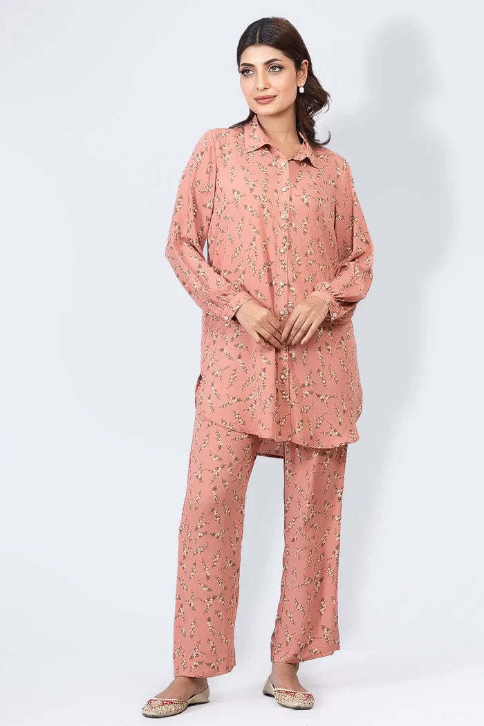Crafted from luxurious double georgette, this two-piece set offers both comfort and effortless style. The hip-covering round hem shirt features a modern twist with metallic stone buttons, adding a touch of glamour. The elegant puff sleeves with cuffs provide a touch of volume and balance the silhouette. Completing the look are the wide-leg pants, creating a flattering and elongating effect. This printed double georgette set is perfect for a day out, a night on the town, or any occasion where you want to look polished and put together.