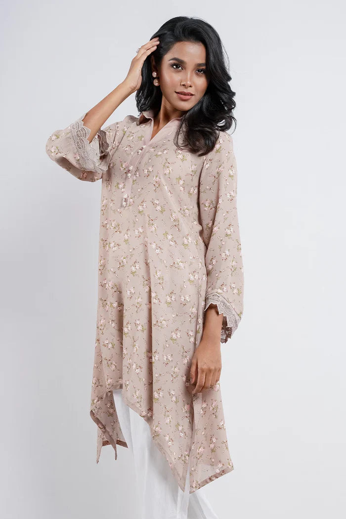 Introducing our beautifully crafted regular-fit kurti, perfect for adding a touch of elegance to your wardrobe. This stylish piece features bell sleeves embellished with decorative lace and is designed with a flattering flare pattern in a trendy high-low style. The addition of decorative buttons and a chic collar neckline enhances its sophisticated appeal. Further adorned with intricate pearl and stone embellishments, this kurti is ideal for both special occasions and everyday wear, blending comfort with timeless fashion.