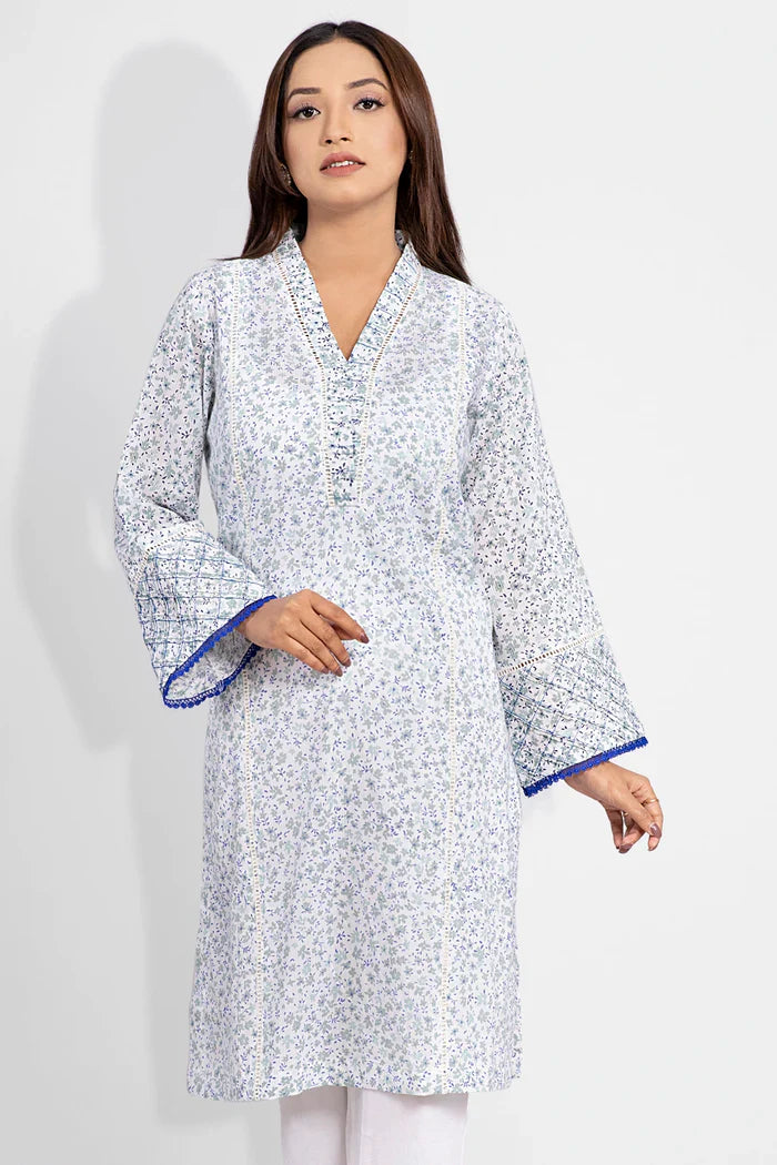 This flattering regular-fit kurti is adorned with a stunning all-over print. Bell sleeves featuring contrasting stitching and delicate lace at the openings add a touch of elegance. Beautiful ladder lace graces the princess line, neck joining line, and sleeves for a visually intriguing look. To top it all off, a unique kaftan neck with contrasting stitching adds a touch of flair.