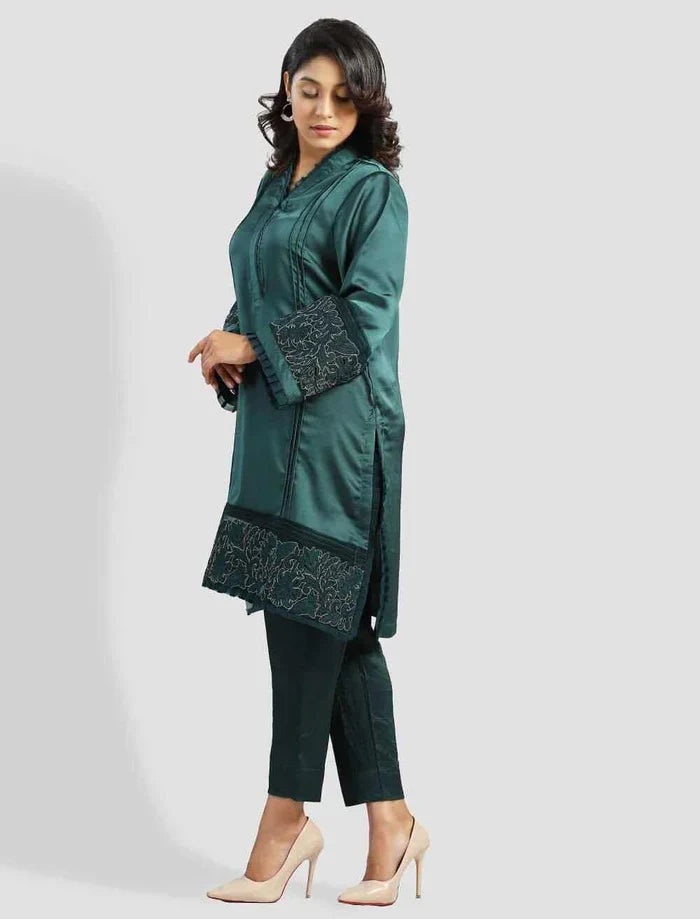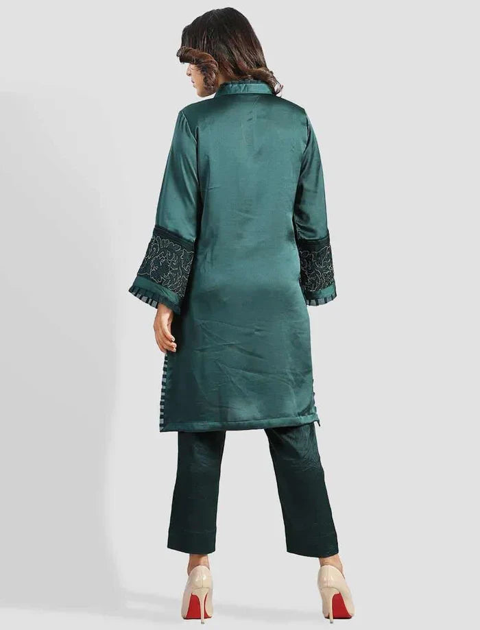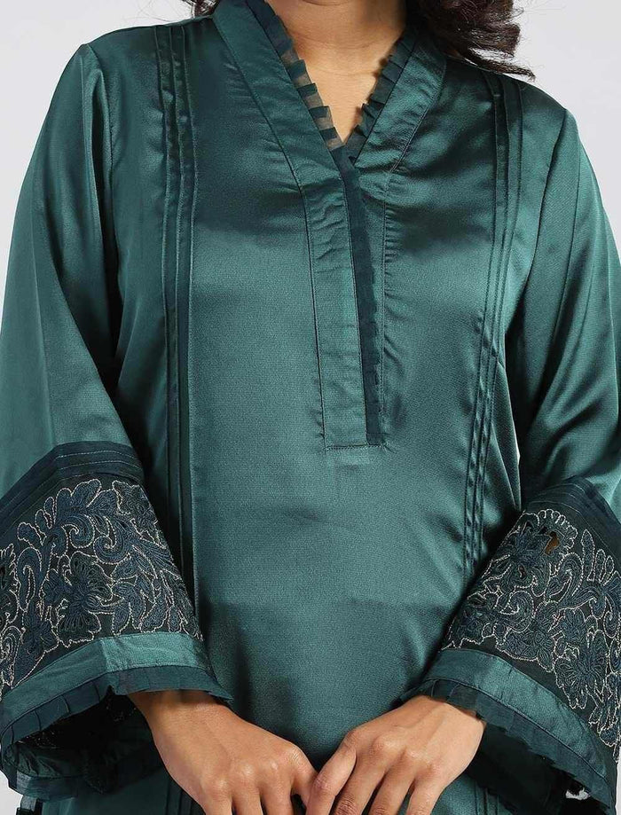 It is a stunning Kurti with long and bell sleeves. This Kurti also has a kaftan neckline with a frill at the end. The bottom hem and sleeve include exquisite embroidery cutwork. It also features a side slit, which adds to its appeal. Muslin fabric has been used to make this apparel, which gives it an exquisite appearance. Comes with a crepe silk bottom. This following attire is sold as 2 piece.