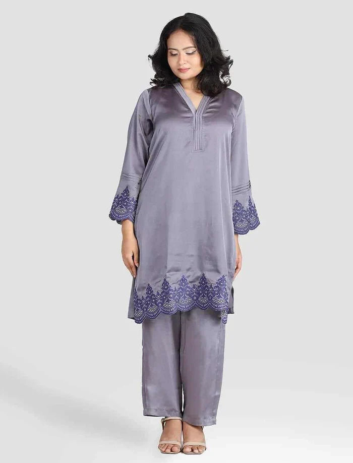 Long Kurti for women is the perfect ethnic wear for your wardrobe. This Kurti has a kaftan neck with pleat, bell sleeve, and embroidery on the sleeve and bottom hem. The fabric used to make this product is 100% polyester—you can wear this long Kurti to any fancy occasion such as weddings or parties. This following attire comes with a bottom and is sold as 2 piece.