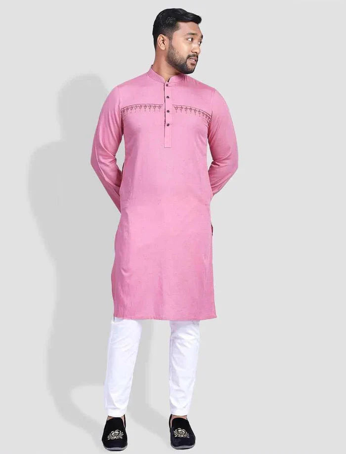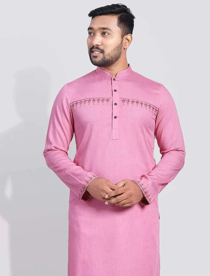 This elegant Panjabi is made with premium quality fabric and styling for an exceptional fit that will make you feel like royalty. Made from 100% Viscose, this Panjabi has Zardozi work done on the chest and sleeve hem. Available in sizes ranging from small to extra-large, this Panjabi can be worn both casually or formally for any occasion.