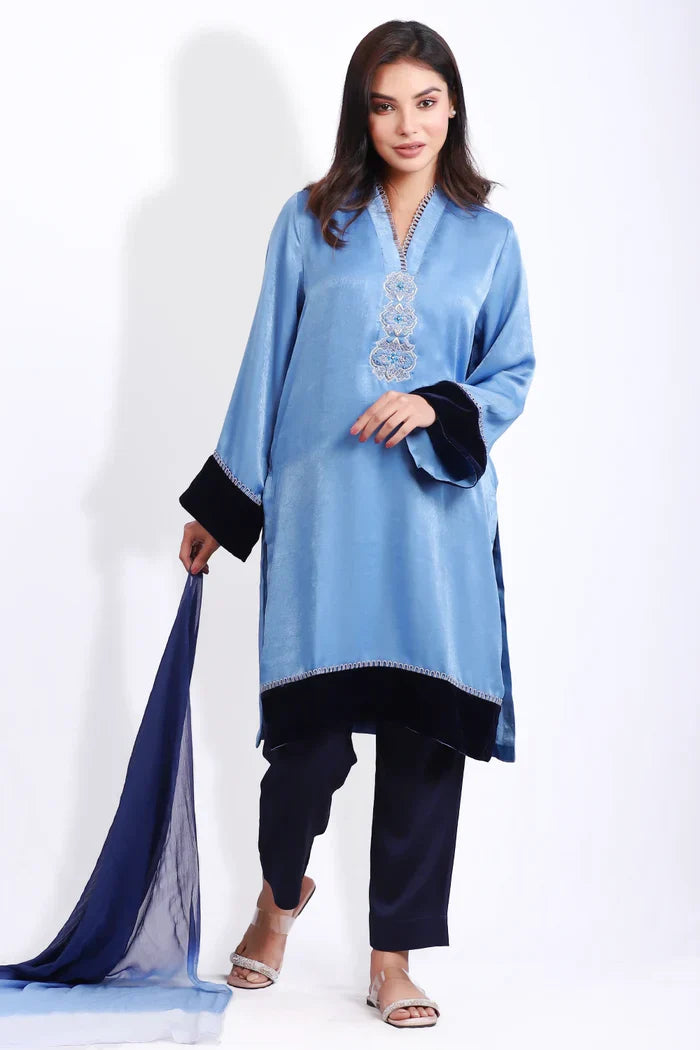 This Kameez should be your attire of choice if you're wanting to establish your presence. It is a Suede Velvet Kameez with Zardozi embellishment work done in the front of the body. Lace has been used for decorative purposes in the front of the body, sleeve hem and bottom. It also has bell sleeves with muslin weaving hem. The dupatta that comes with it has a two-colored shade. This Kameez is made up of 100% suede velvet. This is the attire of choice for those special events you have planned.