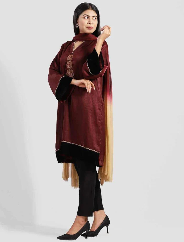 This Exclusive Kameez should be your attire of choice if you're wanting to establish your presence. It is a Suede Velvet Kameez with Zardozi embellishment work done in the front of the body. Lace has been used for decorative purposes in the front of the body, sleeve hem and bottom. It also has bell sleeves with muslin weaving hem. The dupatta that comes with it has a two-colored shade. This Kameez is made up of 100% Suede Velvet. This is the attire of choice for those special events you have planned.