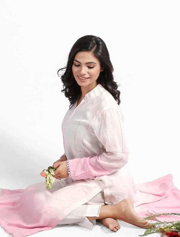 A look of excellence and class can be presented when you wear our Kameez. This is a 1 piece shaded Kameez that is made of 100% Viscose. It is full sleeved with a mandarin collar- and is semi long in length. It is embellished with contrast decorative stitch on the chest, sleeves and collar. The full sleeves come with with off-white lace in the hem and sleeve opening. Wear it to every occasion, and you'll look stunning every time.