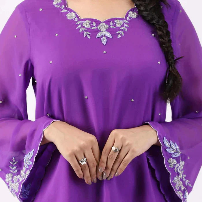 This exclusive Kameez should be your attire of choice if you're wanting to establish your presence. It is a Kameez, crafted in smooth single georgette accompanied with a Crepe Silk bell bottom pant. The Dupatta has a 3 color shade. It has a round neck with Zardozi work done. There is also Zardozi work done to the bell sleeves. This Kameez is made up of 100% Polyester. This is the attire of choice for those special events you have planned.