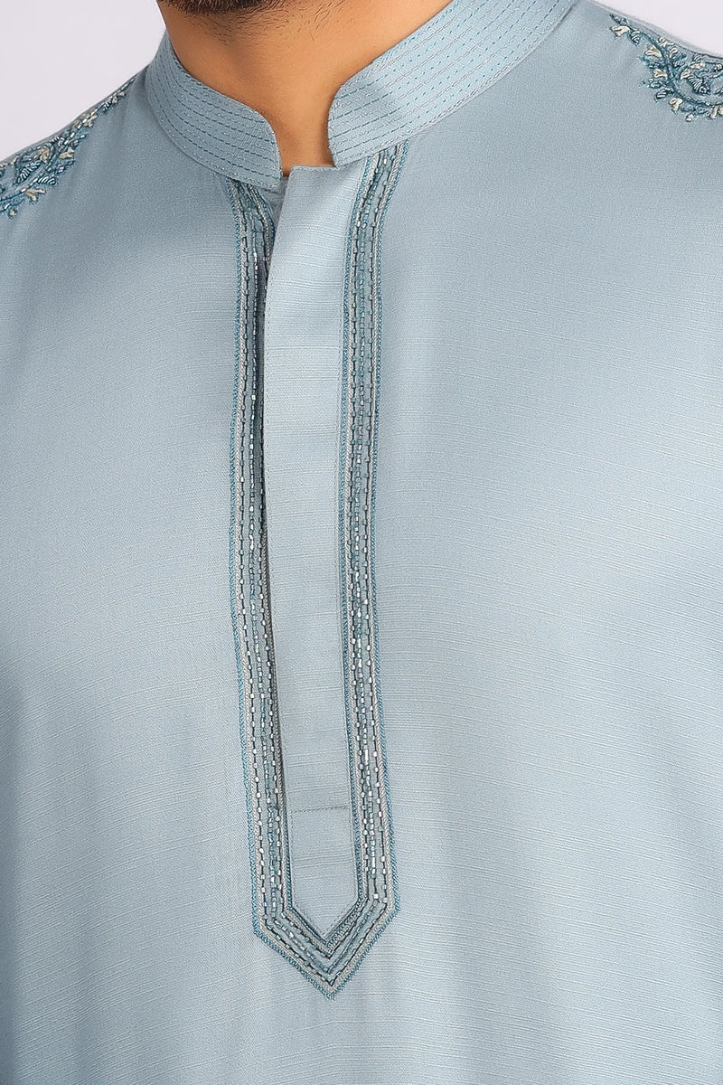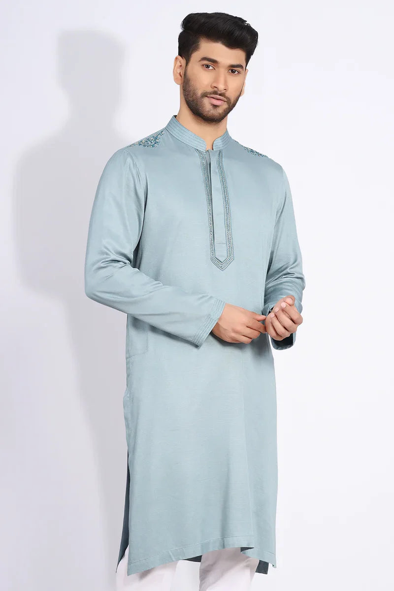 Elevate your style with this Men's Exclusive Zardozi Work Punjabi. The regular fit provides a comfortable and flattering silhouette, while intricate embroidery and zardozi work on the front chest and shoulders create a luxurious look. Lurex thread accents add shimmer to the collar and sleeve openings, and the double placket with matching dyed buttons offers a touch of refined style. Perfect for special occasions, this panjabi is sure to become a treasured piece in your wardrobe.
