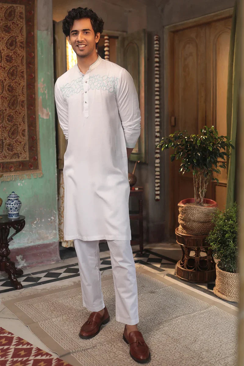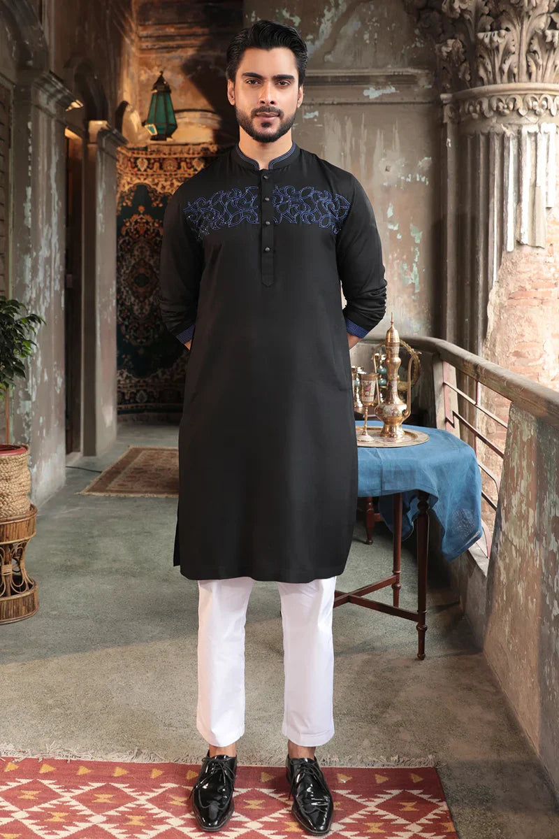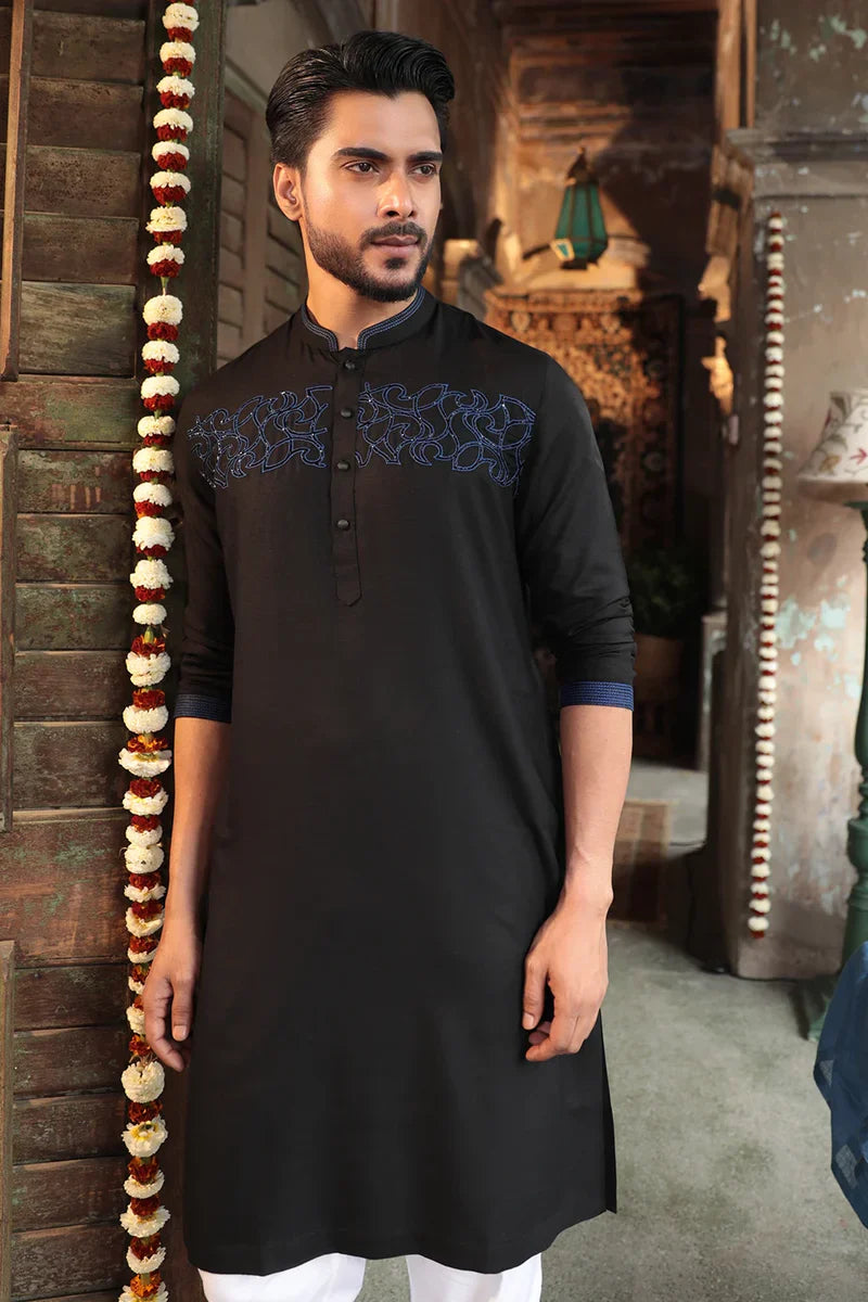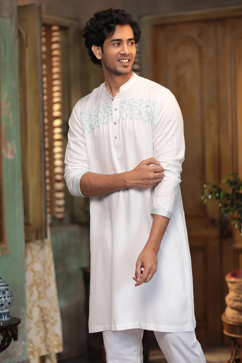 Crafted for a comfortable and flattering regular fit, this Men's Punjabi combines classic style with a touch of modern flair. Decorative stitches with contrasting thread and lurex thread add a subtle shimmer to the collar band and sleeve openings, while eye-catching zardozi work adorns the middle of the chest for a touch of elegance. The button placket features elegant metal buttons, completing the sophisticated look.