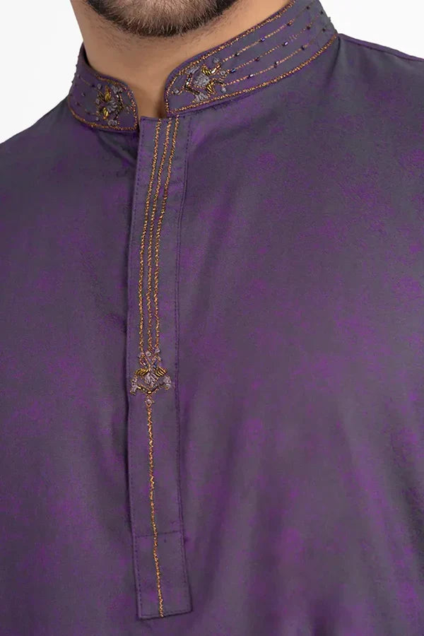 Crafted from luxurious 100% cotton for a comfortable regular fit, this Zardozi worked panjabi elevates your style. The captivating motif on the collar is meticulously embroidered with tonal color threads and lurex thread, while the placket features Zardozi work, using lurex thread for a polished look. Perfect for special occasions, traditional ceremonies, or adding a touch of elegance to your everyday wardrobe.