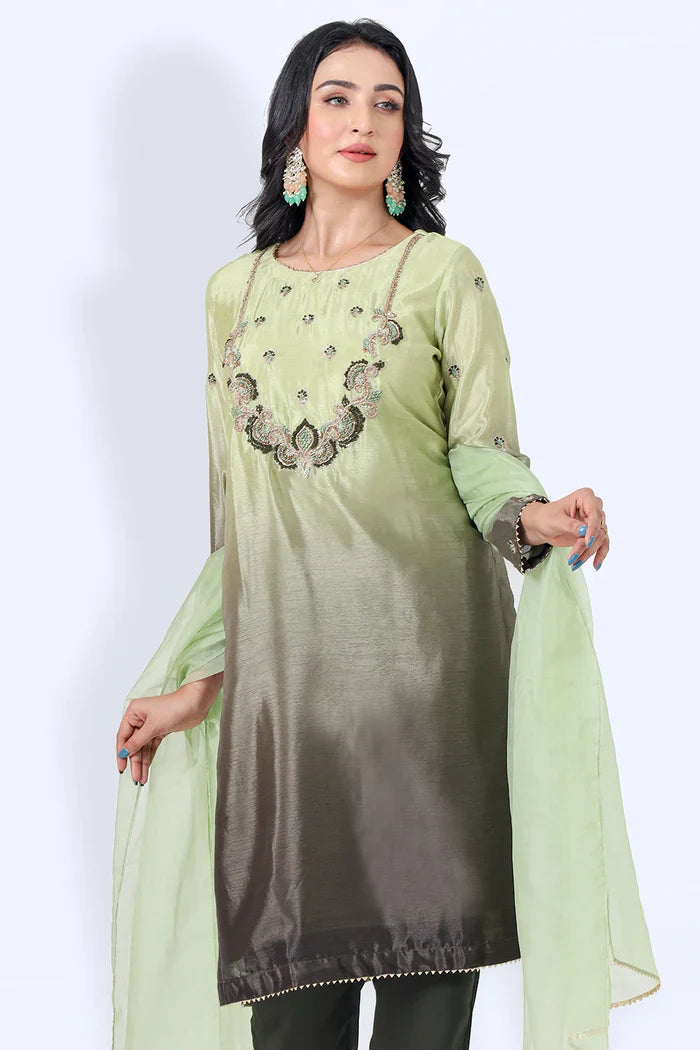Immerse yourself in luxury with this exquisite three-piece ensemble. The shaded silk kameez features stunning Zardozi work on the chest, while the sleeves come alive with an all-over floral motif. A beautiful organza dupatta completes the look, boasting contrasting lacework. The silk straight-cut pants, adorned with a matching lace add a touch of elegance to this breathtaking outfit.