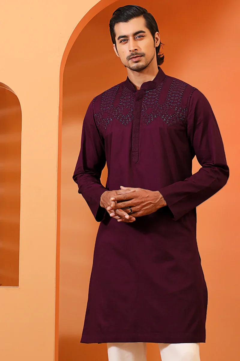 Introducing our Slim Fit Men's Exclusive Panjabi, featuring decorative gap stitch detailing and lurex accents on the front button placket and collar. The highlight of this attire is the heavy Zardozi and Embroidery mixed work on the chest, adding a touch of tradition and finesse to your look. Finished with body color buttons on the placket, it ensures a seamless and polished appearance. Elevate your ethnic wardrobe with our meticulously designed Panjabi, perfect for weddings, festive gatherings, and cultural occasions.